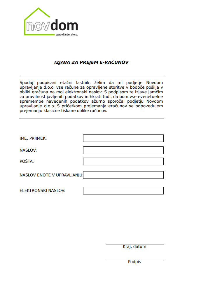 Obrazci Obrazec za javljanje sprememb Obrazec za spremembo števila uporabnikov Pristopna izjava za zavarovanje Izjava za e-račun